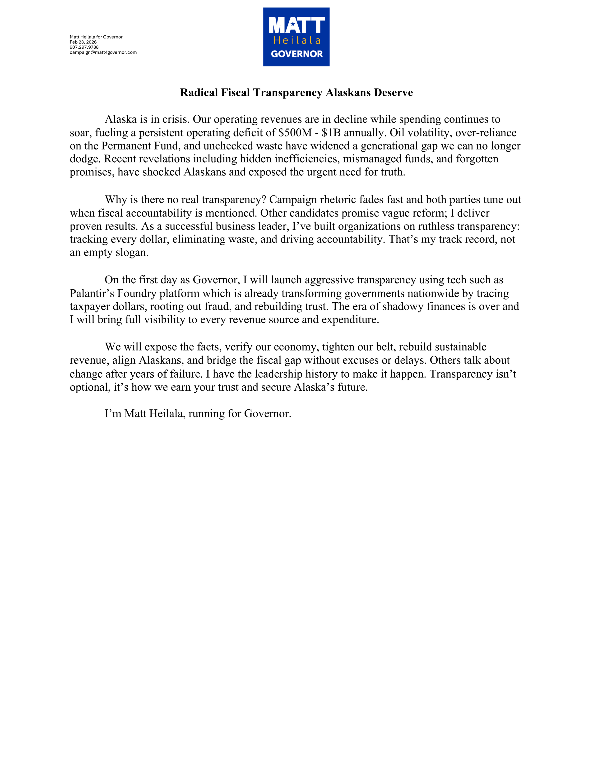 Fisheries Management and Trawling Permanent Fund Dividend Elections Education Veterans Alaska’s prosperity: Energy and Infrastructure Fiscal Transparency Sex Trafficking and Human Rights Healthcare Grand Jury AMHS